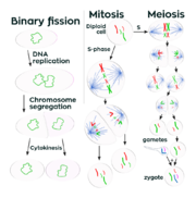 Buněčné dělení eukaryot probíhá odlišně než u prokaryot. Rozlišuje se mitóza, která se uplatňuje při běžném dělení somatických (tělních) buněk, a meióza, díky níž vznikají pohlavní buňky.