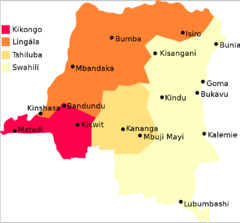 | Jazyk: | francouzština (úřední), lingala (obchodní lingua franca), kingwana (dialekt svahilštiny), kikongo, tshiluba | |