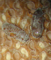 Váčky s pylem, tzv. mikrosporangia, ve zralé a otevřené samčí šištici Encephalartos villosus v Liberci. Jednotlivé šupiny samčí šišky jsou přetvořenými listy, tzv. mikrosporofyly