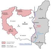 Vývoj polských státních hranic ve 20. století, dnešní německo-polská hranice je vyznačena zeleně