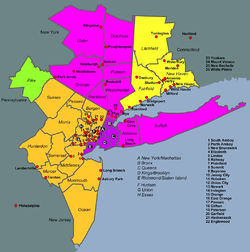 Tato širší oblast zahrnuje největší město ve Spojených státech (New York), pět největších měst v New Jersey-Newark, Jersey City, Elizabeth, Paterson a Trenton a šest ze sedmi největších měst v Connecticutu-Bridgeport, New Haven, Stamford, Waterbury, Norwalk a Danbury. Celková rozloha kombinované metropolitní oblasti je (30 671 km²).