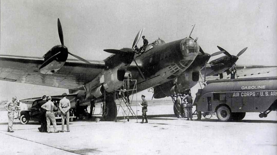 - Русский: Американские офицеры осматривают Пе–8, доставивший в Вашингтон советскую делегацию во главе с наркомом иностранных дел В. М. Молотовым. Маршрут пролегал над оккупированными странами Европы с посадками в Великобритании, Исландии и Канаде. Командиром корабля являлся Эндель Пусэп, вторым пилотом — Владимир Обухов. После проведения переговоров 4 июня машина стартовала в обратный путь и благополучно вернулась в Москву. За выполнение этого полета весь экипаж бомбардировщика был удостоен наград: командир и штурман Александр Штепенко получили звание Героев Советского Союза