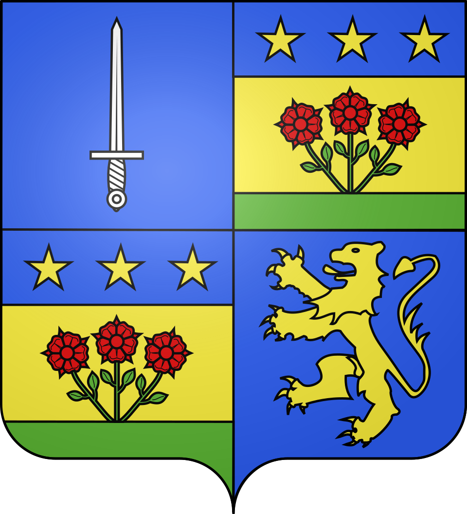 • Français : écartelé, au premier d'azur à l'épée d'argent en pal, au deuxième et au troisième d'or au rosier terrassé de sinople et fleuri de trois pièces de gueules et au chef d'azur chargé de trois étoiles d'or, au quatrième d'azur au lion d'or