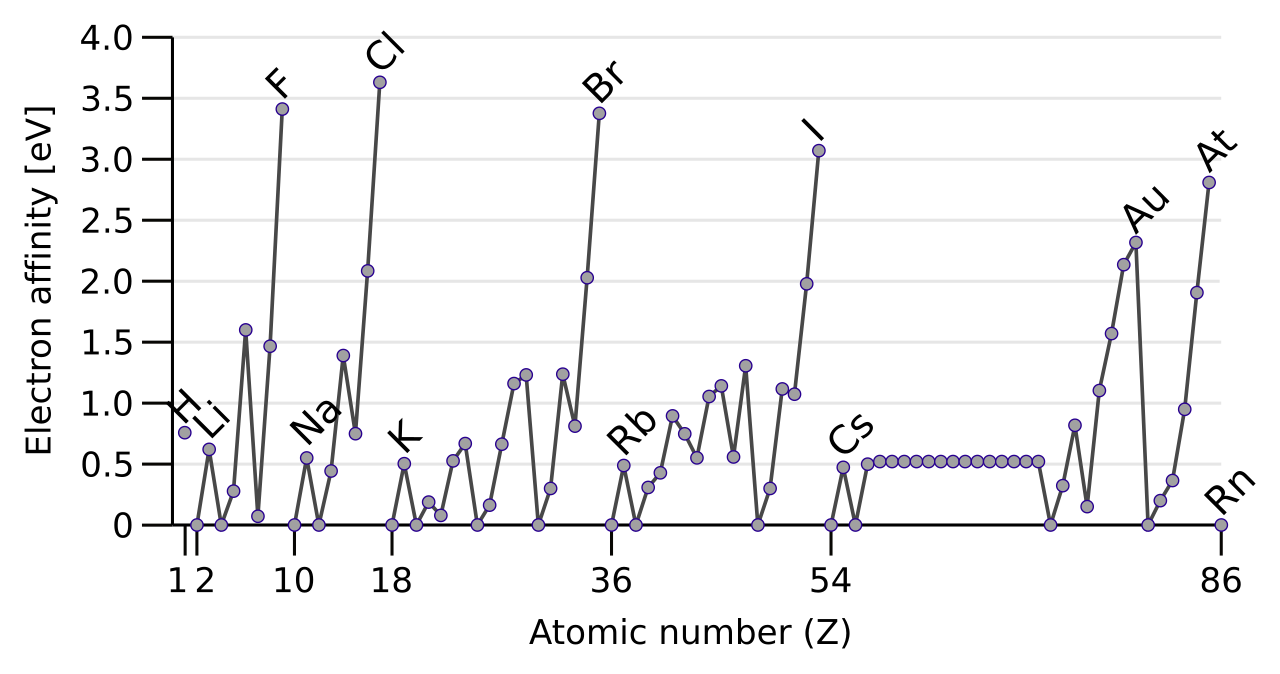 - Hrvatski: Elektronski afinitet elementa u zavisnosti od atomskog broja (linije su vodič za oko i pokazuju trend po periodama; plemeniti plinovi su „0. grupa” koja započinje trend).