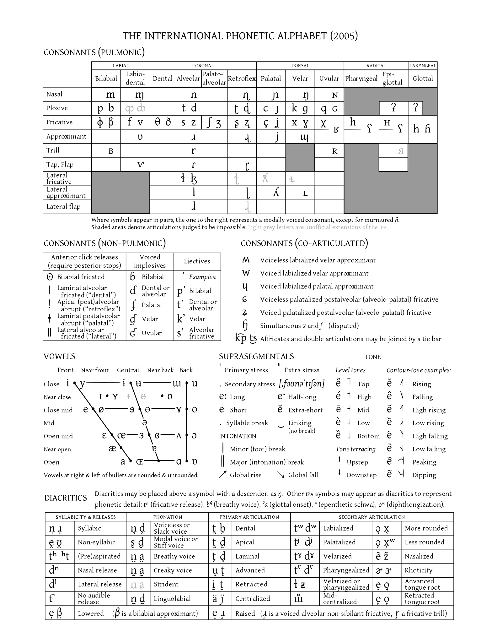 - English: The full International Phonetic Alphabet as of 2005, including the labiodental flap and (in grey) some ad hoc symbols found in the literature.