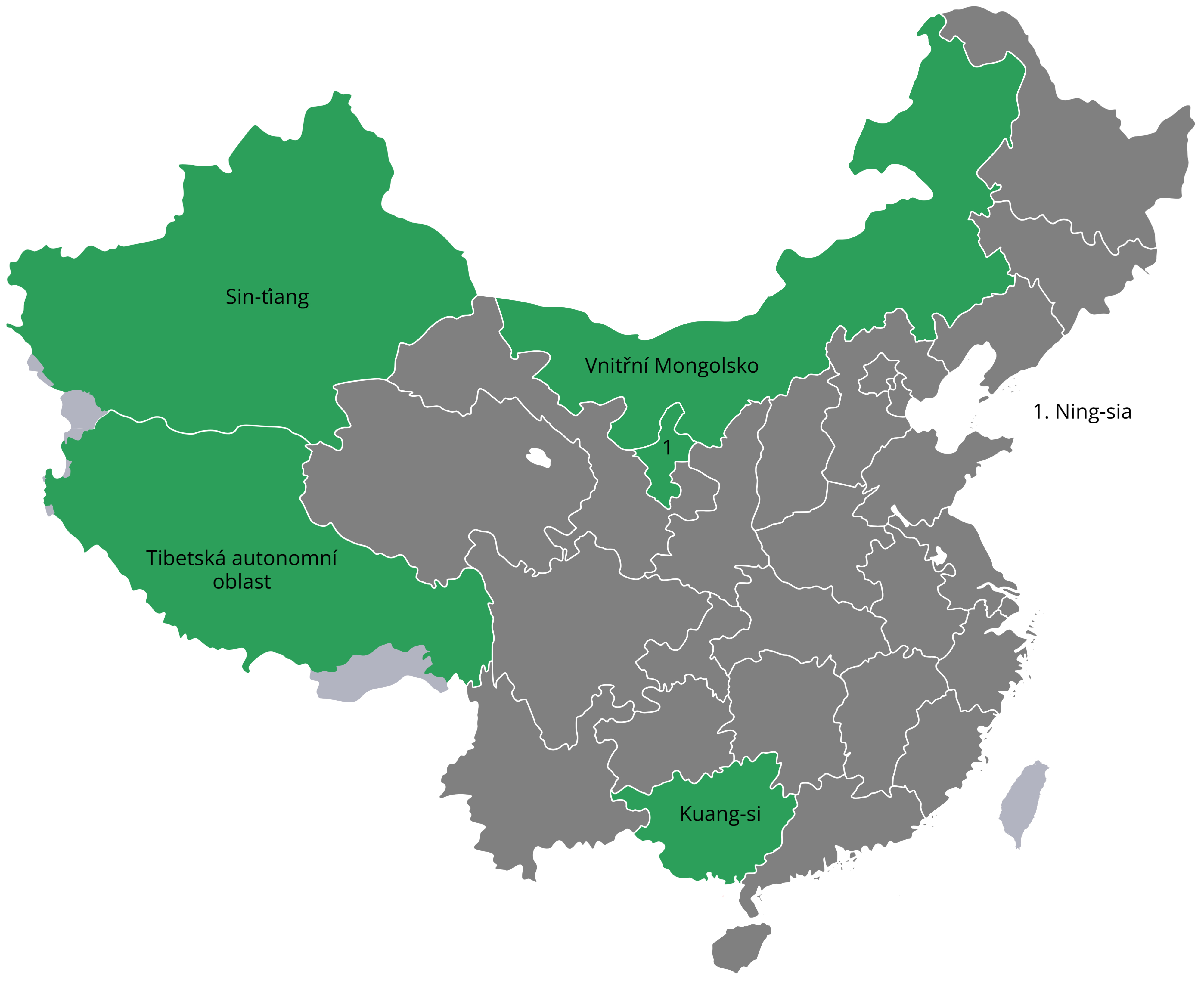 - English: This map shows autonomous regions of China in Czech and Slovak using Švarný's transcription of Chinese.