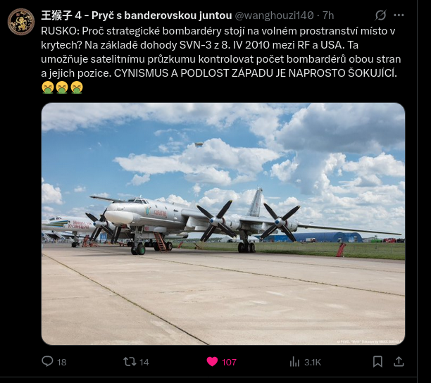 | současná | 2. 6. 2025, 16:01 | 612×544 (339 kB) | Sysop (diskuse | příspěvky) | (Snímek výřezu webových stránek + serveru <u>www.X.com</u> ukazuje proč strategické bombardéry * Date: 2 June 2025 Povoluji jeho použití pod licencí – Fair use (obsah serveru <u>www.X.com</u> je chráněn autorským právem). Author: Michal) |