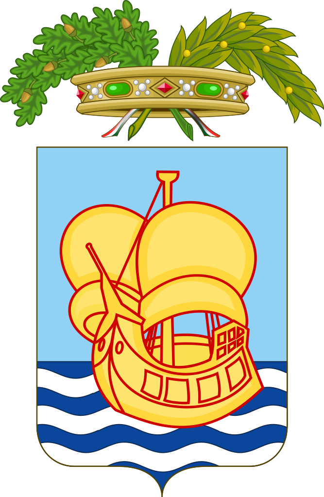 - Blazon: Italiano: Campo di cielo, alla cocca d'oro, bordata di rosso, navigante sul mare d'azzurro, fluttuoso d'argento, attraversante, munita di quattro vele d'oro, bordate di rosso, dell'albero e del sartiame, dello stesso. L'immagine dell'imbarcazione si ispira a un bassorilievo di Agostino di Duccio (1418-c.1481) nel Tempio malatestiano a Rimini.