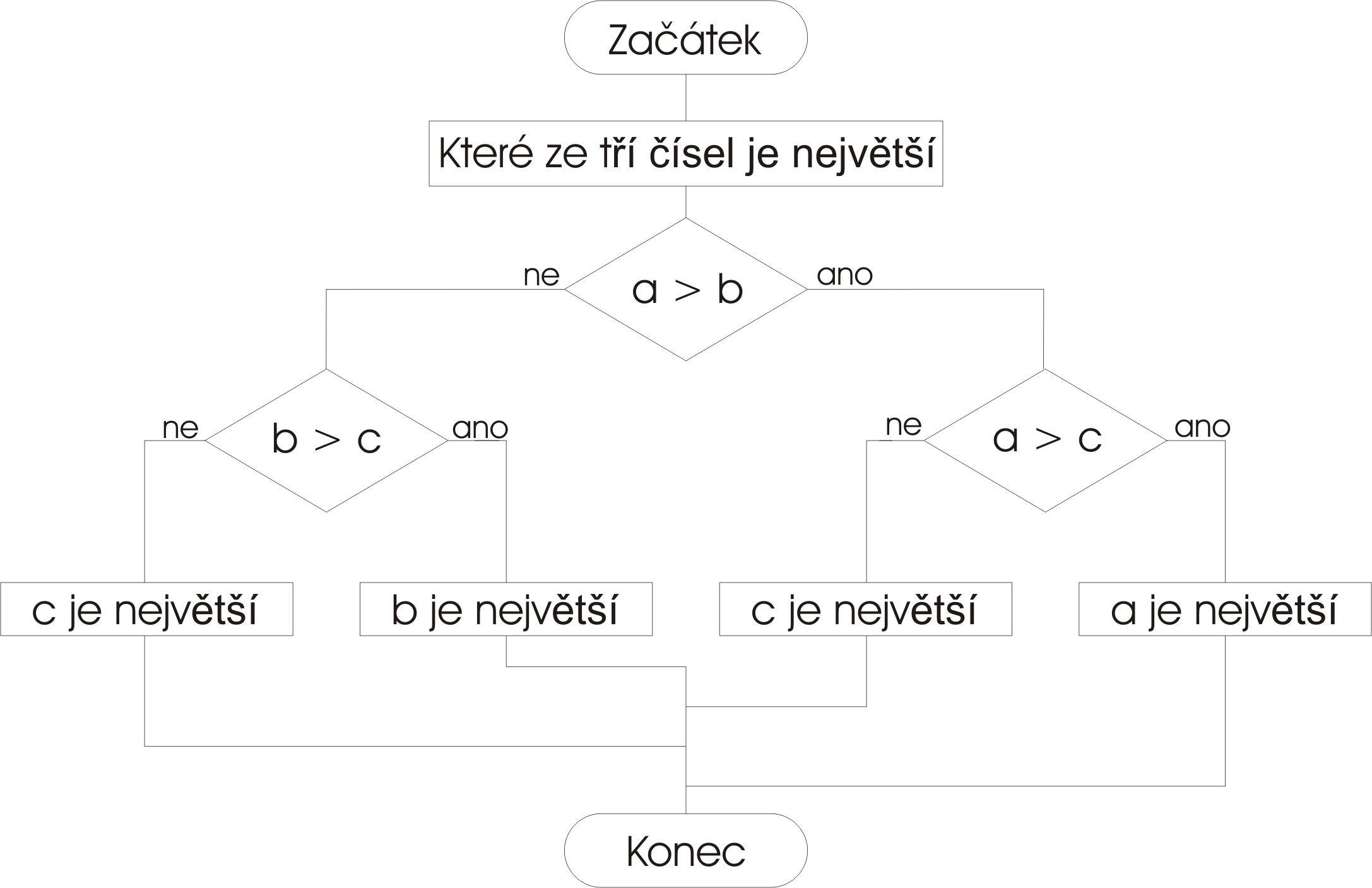 Obrázek + Description: Vývojový diagram pro program jazyka C - které ze tří čísel je největší