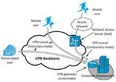 VPN sítě se typicky vytvářejí mezi počítači, které jsou připojeny k Internetu. Lze tak například zajistit připojení firemních notebooků připojených kdekoliv k Internetu do firemního intranetu (vnitřní firemní sítě). K propojení se ve firemní síti nejprve zprovozní VPN server, zajistí se připojení k Internetu, ke kterému se pak připojují VPN klienti z jakéhokoliv místa, které je také k Internetu připojeno. VPN server plní funkci síťové brány, která zprostředkovává připojení, zajišťuje zabezpečení a šifrování veškeré komunikace.