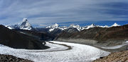 Pohled na východní stěnu od Monte Rosa Hütte a ledovec Gorner a Grenz