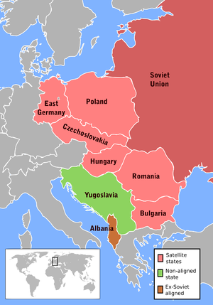 Pojem Východní blok bylo neoficiální označení Sovětského svazu a jeho politických satelitů; jako protiklad proti nim byl Západ. Vojenskou organizací východního bloku byla Varšavská smlouva, hospodářskou pak RVHP (Rada vzájemné hospodářské pomoci), obě měly sídlo v Moskvě. Přestože země, které do tohoto uspořádání patřily byly formálně nezávislé, fakticky byly z velké části závislé na politice SSSR. To se prokázalo, když sovětská vojska potlačila občanské nepokoje v NDR (1953), Maďarsku (1956) a při sovětské invazi do Československa (1968). Albánie byla součástí Východního bloku pouze do roku 1956, kdy se albánská politická scéna přeorientovala na Čínu. Byl to důsledek roztržky mezi SSSR a Čínou, následně vládnoucí strana PPSH označila Chruščovovy reformy za revizionismus. Přestože Jugoslávie byla od roku 1946 oficiálně socialistickou zemí, nikdy se hospodářsky ani kulturně neorientovala na SSSR. Spolupracovala také se západní Evropou, nikoli pouze s východní. Země byla oficiálně neutrální, odmítala dělení světa na dva bloky supervelmocí a pomáhala založit Hnutí nezúčastněných zemí.