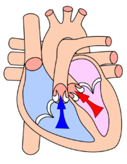 Při diastole síní (za současné systoly komor) přitéká do pravé síně oběma dutými žilami krev z velkého tělního oběhu, zatímco do levé síně přitéká krev z plicních žil. Následuje systola obou síní (současně s diastolou obou komor), při které je krev ze síní vypuzena do komor. Aby nedocházelo ke zpětnému toku krve z komor do síní, je mezi pravou síní a komorou trojcípá chlopeň a mezi levou síní a komorou chlopeň dvojcípá (viz výše). Tyto chlopně se při následné systole komor uzavřou a krev z komor je tak vypuzena do plicního kmene a do aorty. Zpětnému toku krve do komor brání poloměsíčité chlopně uzavírající jak plicní kmen tak aortu.