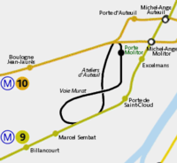 Při výstavbě stanice Porte d'Auteuil na lince 10 ve 30. letech 20. století se počítalo s pozdějším napojením do stanice Porte Molitor a přes ní propojením s linkou 9 ve stanici Porte de Saint-Cloud. Tato větev měla sloužit především při dopravě na nedaleký stadion Parc des Princes. Stanice i koleje byly sice postaveny, ale nikdy veřejnosti nezačaly sloužit a dnes se používají jako vlakové depo pro obě linky.