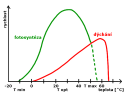 Průběh reakcí obecně urychluje zvýšení teploty o 10 °C 2–3krát.[15] Rychlost fotosyntézy závisí na teplotě exponenciálně a limitujícím faktorem je intenzita světla. Jelikož teplota ovlivňuje i další fyziologické pochody, je závislost fotosyntézy na ní složitá. Při nízkých teplotách rostliny fotosyntetizují pomalu. Zvyšováním teploty rychlost roste až po hranici teplotního optima. Poté pomalu klesá a při 35–45 °C se zastavuje. Současně s fotosyntézou se však zvyšuje i dýchání a obě rychlosti se zvyšují nerovnoměrně.[15] Vliv teploty na fotosyntézu se výrazněji projevuje při vyšší intenzitě světla. Různý vliv má teplota u C3 a C4-rostlin. Evolucí rostlin došlo k adaptaci na různé teplotní podmínky.[15]