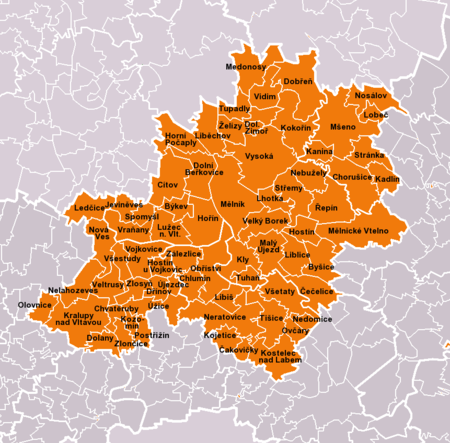 Býkev • Byšice • Cítov • Čakovičky • Čečelice • Dobřeň • Dolany • Dolní Beřkovice • Dolní Zimoř • Dřínov • Horní Počaply • Hořín • Hostín u Vojkovic • Hostín • Chlumín • Chorušice • Chvatěruby • Jeviněves • Kadlín • Kanina • Kly • Kojetice • Kokořín • Kostelec nad Labem • Kozomín • Kralupy nad Vltavou • Ledčice • Lhotka • Liběchov • Libiš • Liblice • Lobeč • Lužec nad Vltavou • Malý Újezd • Medonosy • Mělnické Vtelno • Mělník • Mšeno • Nebužely • Nedomice • Nelahozeves • Neratovice • Nosálov • Nová Ves • Obříství • Olovnice • Ovčáry • Postřižín • Řepín • Spomyšl • Stránka • Střemy • Tišice • Tuhaň • Tupadly • Újezdec • Úžice • Velký Borek • Veltrusy • Vidim • Vojkovice • Vraňany • Všestudy • Všetaty • Vysoká • Zálezlice • Zlončice • Zlosyň • Želízy |