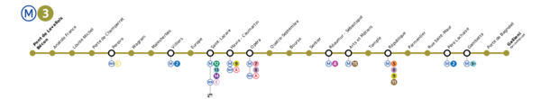 První úsek této linky byl zprovozněn již 10. října roku 1904. Spojoval stanice Père Lachaise a Villiers. Jeho výstavba trvala déle než se předpokládalo, hlavně díky překládání různých vedení (elektřina, plyn). Už další rok byla prodloužena, pro cestující se otevřela stanice Gambetta. Do první světové války se trasa rozšiřovala převážně západním směrem, na východním ale byly postupně také otevřené některé nové úseky, avšak mnohem kratší. V roce 1967 právě na lince 3, na jako první z celé sítě, byly nasazeny novější vozy, dodnes se používají stále, na většině linkách (byly ale však postupně modernizovány). Roku 1971 byl nový úsek do stanice Gallieni zprovozněn, zároveň trať ve směru Gambetta – Porte des Lilas byla oddělena od linky a přeznačena jako 3bis. Od této doby nedošlo již k žádným změnám.