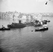 Hluboko ponořený poškozený tanker SS Ohio s cenným nákladem leteckého paliva připlouvá 15. srpna 1942 do La Valletty