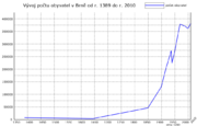 K 18.9.2009 mělo Brno 404 381 obyvatel.[10] Největší přírůstek zažilo obyvatelstvo Brna v období let 1850–1919 (za průmyslové revoluce), především připojením okolních obcí; do roku 1940 pak počet obyvatel stagnoval, a od 50. let 20. století opět rostl. Mírný pokles po roce 1989 kopíruje trend velkých měst v celé republice vlivem tzv. suburbanizace: Lidé se stěhují za administrativní hranice města, kde však nadále pracují a využívají služby. Statisticky tak v Brně lidí ubývá, fakticky jejich počet roste, což indikuje rostoucí počet obyvatel okresu Brno–venkov, zvláště v prstenci obcí sousedících s Brnem.