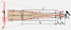 1 - objektiv, 2 - okulár, 3 - oko, 4 - předmět, 6 - zvětšený obraz, 7 - tubus; f1 - ohnisková vzdálenost objetivu, f2 - ohnisková vzdálenost okuláru.