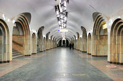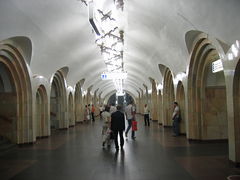 Podobně jako podzemní část stanice je ztvárněn i její vestibul; ten je – jak již bylo uvedeno – povrchový, a patří mezi ukázky tzv. socialistického realismu. Jsou zde umístěny mozaiky s tematikou Lenina, znaků všech tehdejších svazových republik či sovětských atletů.