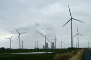 Pohled na několik větrných elektráren před elektrárnou uhelnou