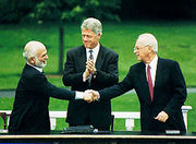 Téhož roku proběhla za vlády Jicchaka Šamira Madridská konference.[78] Ta byla průlomová tím, že se poprvé u jednoho stolu sešly znepřátelené strany, jejichž představitelé zde spolu přímo hovořili poprvé od Války za nezávislost.[78] Během roku 1992 docházelo k přímým schůzkám mezi Izraelci a Araby v různých městech po celém světě.[79] Tentýž rok vyhrál volby Jicchak Rabin. Tzv. Mírová dohoda z Osla byla podepsána 13. září 1993 ve Washingtonu. Z ní vyplývalo, že má být po přechodnou dobu pěti let na území Západního břehu a pásma Gazy ustanovena Palestinská samospráva.[80] V roce 1994 byla mezi Izraelem a Jordánskem podepsána Izraelsko-jordánská mírová smlouva.[81]