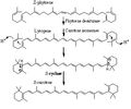 Biosyntéza karotenů vychází z 3-fosfoglyceraldehydu, který s pyruvátem tvoří pětiuhlíkatý dimetyllallylpyrofosfát. Spojením dvou dimetyllallylpyrofosfátů vznikne desetiuhlíkatý geranylpyrofosfát. Spojením dvou geranylpyrofosfátů vzniká dvacetiuhlíkatý geranylgeranylpyrofosfát, který se dále přeměňuje v lykopen. Lykopen je už schopný absorbovat světlo. Z lykopenu pak vzniká buď alfa-karoten, který se dále přeměňuje na lutein, nebo beta-karoten. Beta-karoten je schopen xantofylového cyklu.[1]