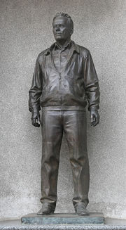 Socha Michaila Kalašnikova stojí před Kalašnikovým muzeem v městě Iževsk