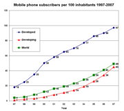 Počet uživatelů mobilních telefonů na 100 obyvatel mezi 1997 a 2007