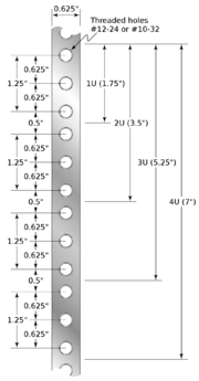 Typická sekce rackové kolejnice, ukazující distribuci rackových jednotek.
