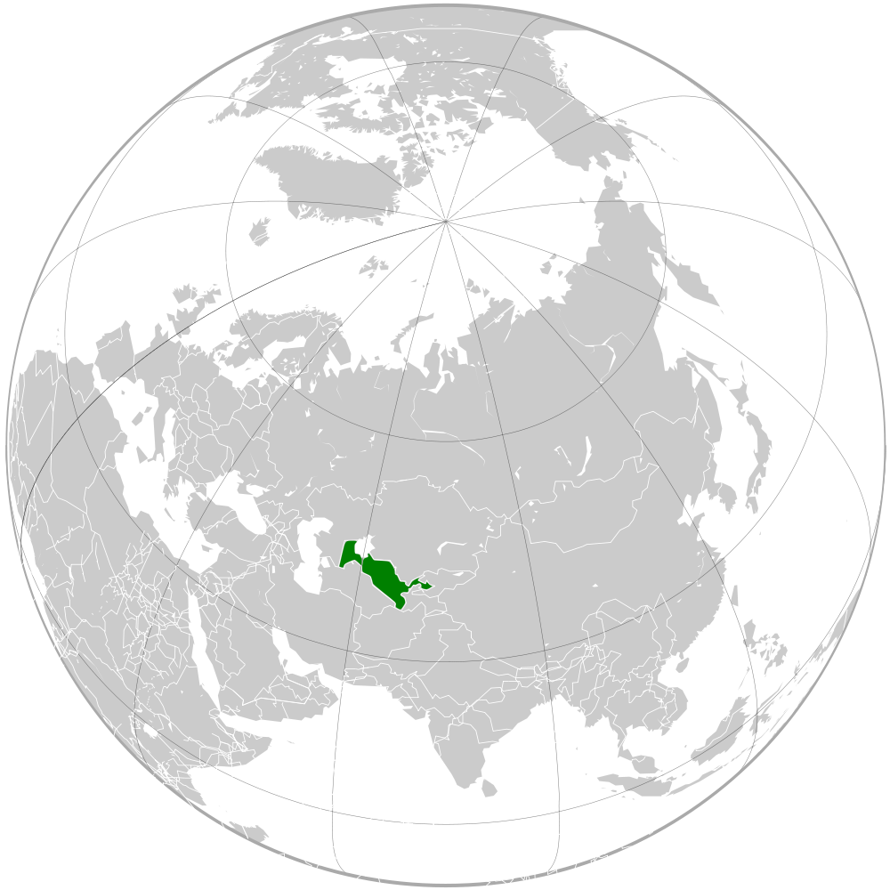Mapa + Description: On the globe the Republic of Uzbekistan is highlighted in a dark green color. The file was created in Inkscape.