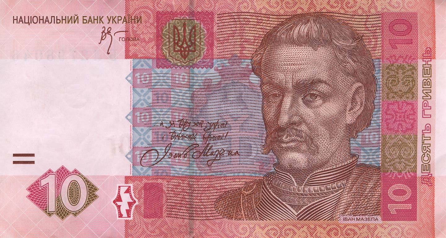 - Русский: 10 гривен 2005 г. выпуска, образца 2004 г. Аверс. Подпись В.Стельмаха