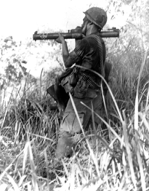 Fotografie + Description: Ignoring enemy fire, SSG Oscar C. Gallegos, Co B, 2nd Bn, 327th Inf, 101st Abn Div, takes careful aim with the M-72 LAW (light anti-tank weapon) during Operation "Wheeler." Vietnam, 1967