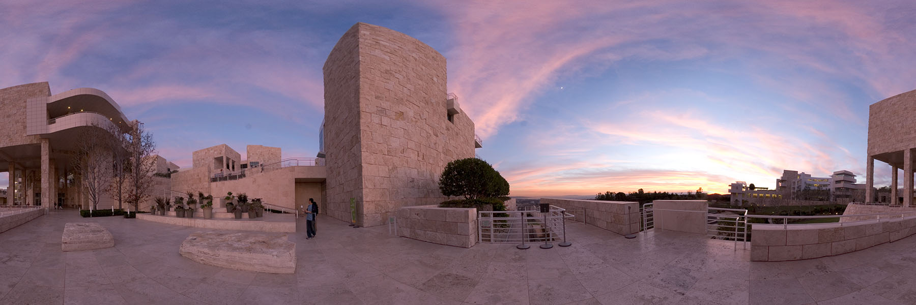Fotografie + Description: Panorama of a Getty Center terrace, below the Exhibition Pavillion at dusk.