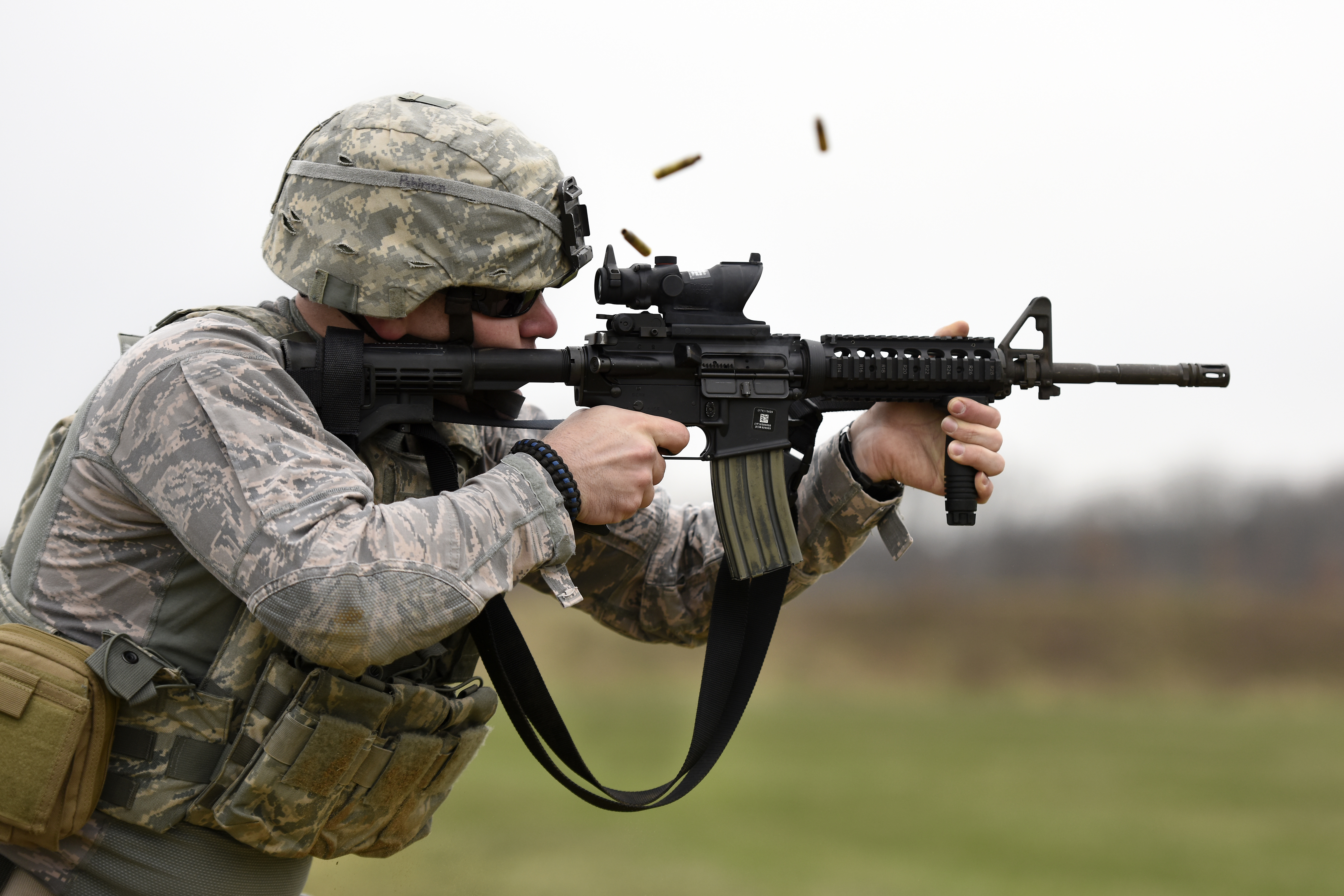 - Senior Airman Benton Pohlman, a 180th Fighter Wing security forces specialist, Ohio Air National Guard, fires an M4 carbine rifle during target practice April 12, 2017, at the Fort Custer Training Center in Battle Creek, Mich. Weapons training allows Airmen to provide protection of the homeland and effective combat power to their combatant commander.