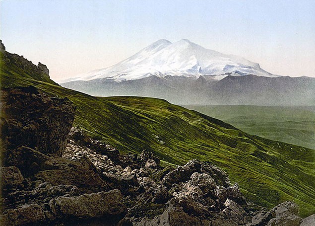Fotografie + English: 19th-century postcard of Mount Elbrus in the Caucasus Mountains.