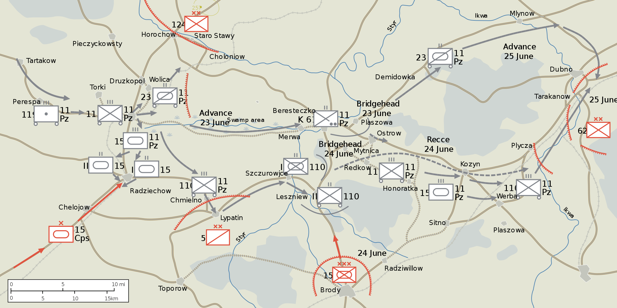 Vojenská mapa + English: Map of the battle of Dubno (aka Battle of Brody), 13 July 2009 + pochází z Wikimedia Commons, kde má status – Creative Commons Attribution-Share Alike 3.0 Unported (autor: Beringar at en.wikipedia).
