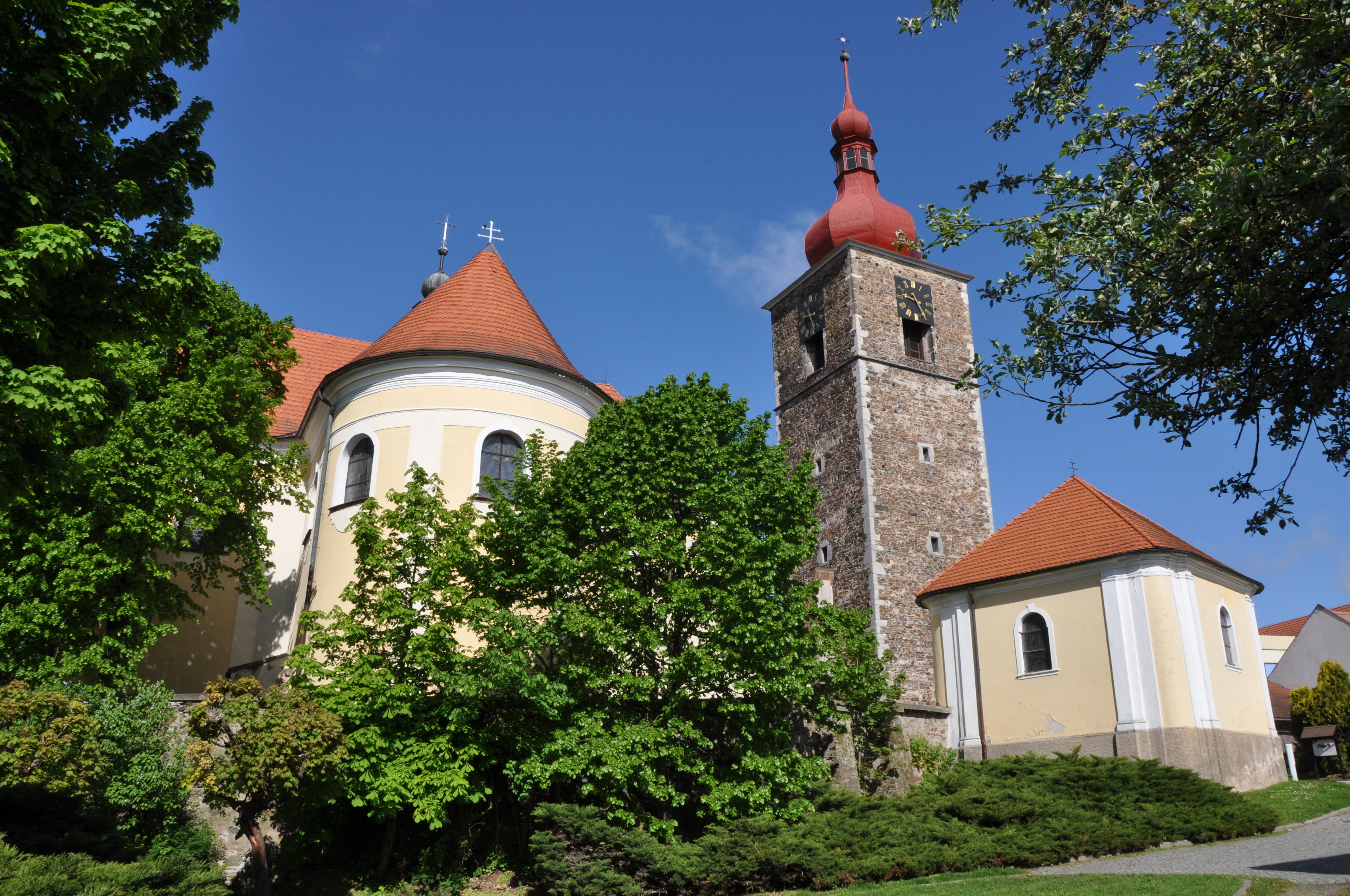 Fotografie + Description: Farní kostel - Narození sv. Jana Křtitele. Základní kámen položen 1. dubna 1750 dostavěn a 24.července roku 1753 slavnostně vysvěcen. V roce 1767 postihl kostel a faru velký ničivý požár.