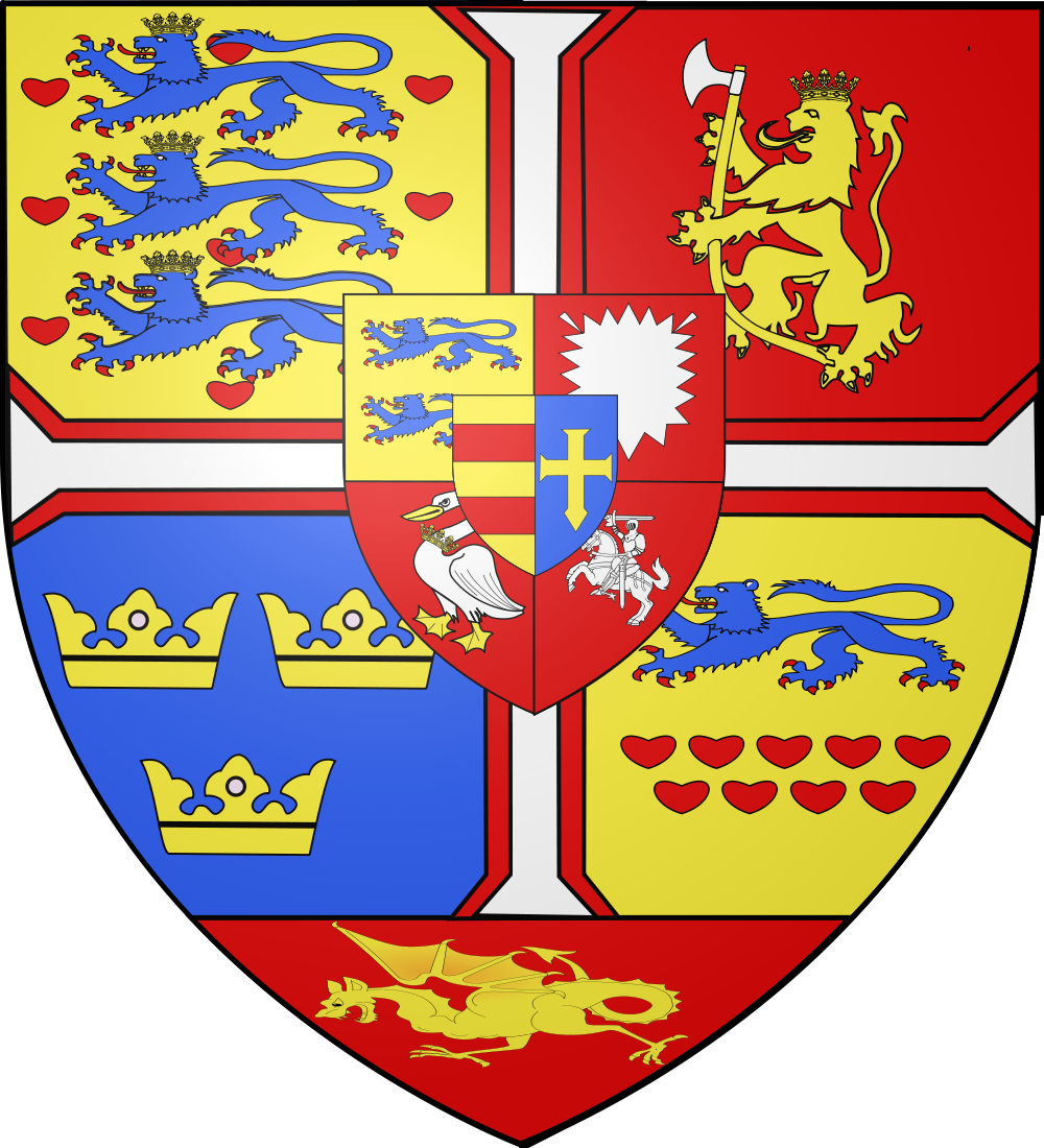- Français : Ecartelé : à la croix pattée d'argent bordée de gueules, qui est le Danebrog, cantonnée en I, d'or, à neuf coeurs de gueules, posés en trois pals, à trois lions léopardés d'azur, armés et lampassés de gueules, couronnés du champ, brochant sur-le-tout (de Danemark) ; en II, de gueules, au lion couronné d'or, tenant dans ses pattes une hache danoise d'argent, emmanchée du second (de Norvège ancien) ; en III, d'azur, à trois couronnes d'or (de Suède moderne) ; en IV, d'or au lion léopardé d'azur soutenu de neufs coeurs de gueules ordonnés 5 et 4 (du Royaume des Goths) ; en plaine, de gueules au dragon d'or (du Royaume des Vandales) ; sur-le-tout écartelé : 1 , d'or, à deux lions léopardés d'azur, armés et lampassés de gueules (de Schleswig) ; 2 de gueules, à la feuille d'ortie d'argent (de Holstein) ; 3 de gueules, au cygne d'argent, becqué, membré et colleté d'une couronne d'or (Storman) ; 4 de gueules, au cavalier armé d'argent (Ditmarsie) ; sur-le-tout-du-tout parti d'or à deux fasces de gueules (de Oldenbourg) et d'azur, à la croix pattée, au pied fiché d'or (de Delmenhorst)