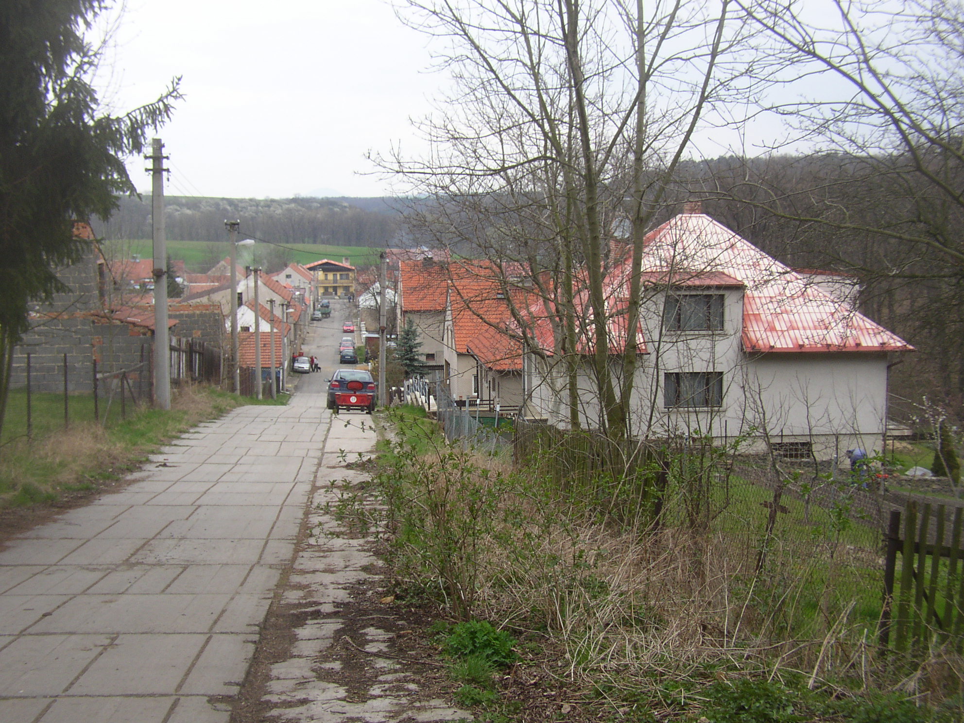 - English: Blevice, Kladno District, Czech Republic. A street in eastern part of the village as seen from its upper end, from vicitity of the Jewish cemetery towards NNE. Location of the village in a valley surrounded by wood is quite noticeable.