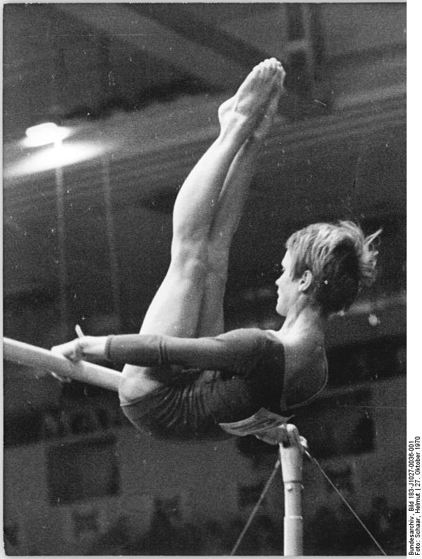 • Original caption: Zentralbild-Schaar-27.10.1970-ma-Ljubljana (Jugoslawien): XVII. Weltmeisterschaften im Turnen. Den zweiten WM-Titel für die DDR, erkämpfte bei den Final-Wettbewerben Karin Janz am Stufenbarren. Sie erhielt für ihren Kürvortrag mit 9,8 Punkten die höchste Wertung aller sechs Finalteilnehmerinnen und kam damit auf 19,55 Punkte.