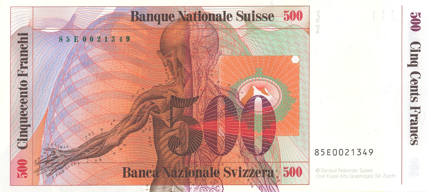 Fotografie + English: Back of the 500 Swiss Francs banknote, part of series 7 of Swiss banknotes. See http://www.snb.ch/en/iabout/cash/history/id/cash_history_serie7 for more information.