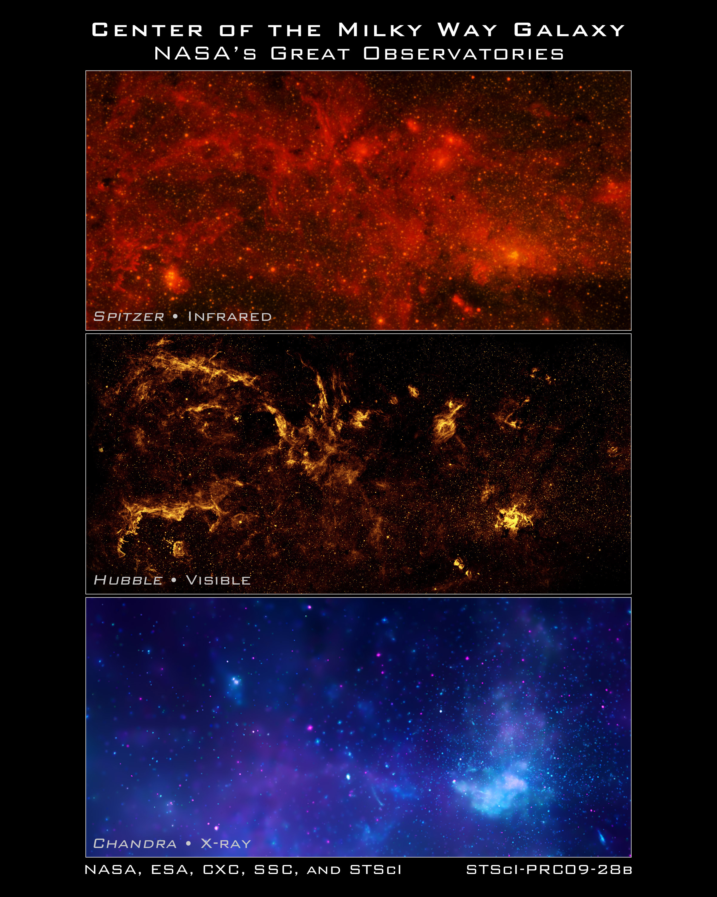 Fotografie + English: In celebration of the International Year of Astronomy 2009, NASA's Great Observatories -- the Hubble Space Telescope, the Spitzer Space Telescope, and the Chandra X-ray Observatory -- have produced a matched trio of images of the central region of our Milky Way galaxy. Each image shows the telescope's different wavelength view of the galactic center region, illustrating the unique science each observatory conducts.