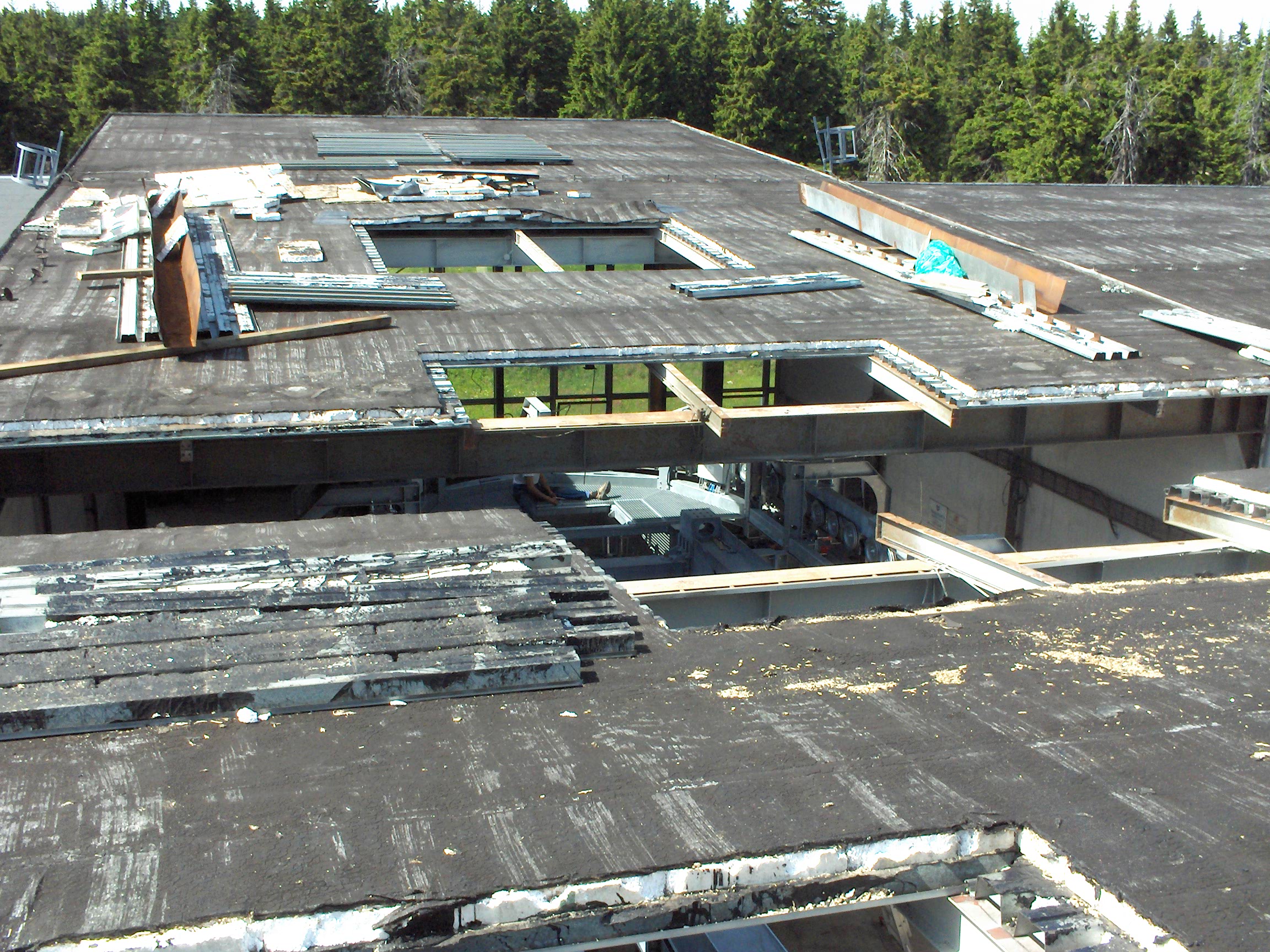 - Čeština: Pro účely stavby se musela střecha na několika místech rozřezat