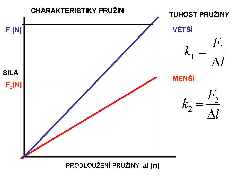 Obrázek + Čeština: Diagram znázorňuje tzv. charakteristiky pružin, což jsou přímky vyjadřující lineární závislost mezi silou působící na pružinu a její pružnou deformací. Sklon přímek udává tuhost pružin, což je síla potřebná k jednotkové deformaci pružiny.