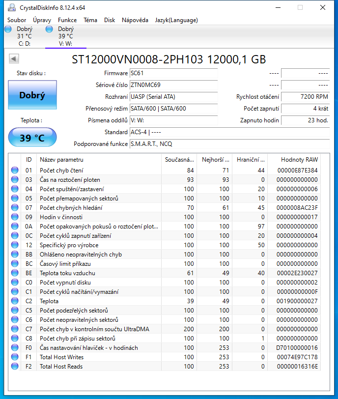 Snímek + English: CrystalDiskInfo is an MIT-licensed S.M.A.R.T. utility for reading and monitoring disk drive status. Like CrystalDiskMark, this tool is designed with an emphasis around solid state devices, supporting NVMe connections in addition to the usual PATA and SATA. Other feature include Intel RAID support, e-mail and sound warnings, and AAM/APM adjustment.
