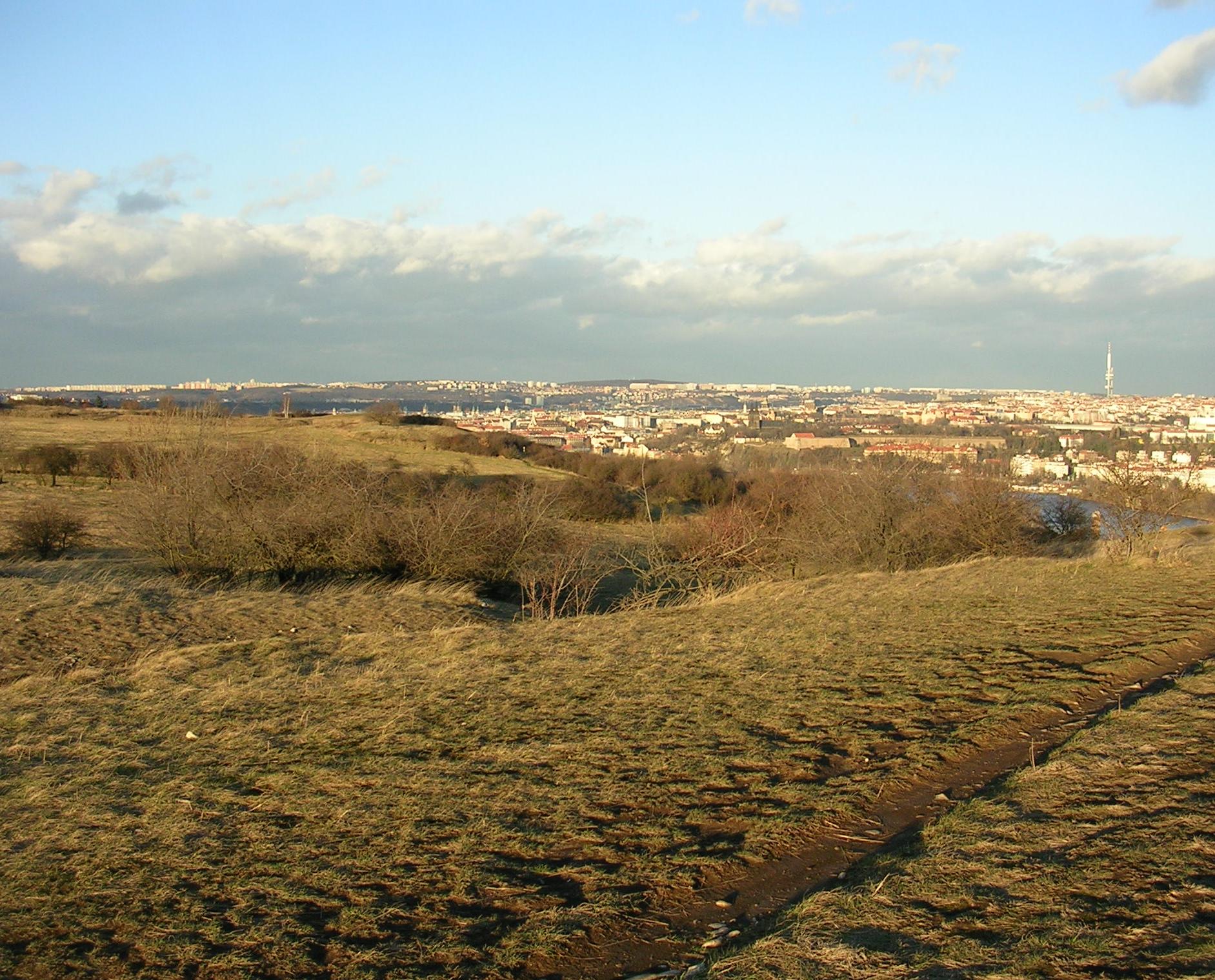 Fotografie + Čeština: Výhled z Děvína (Praha, Radlice): pláň poblíž bývalého hradu a výhled na město.