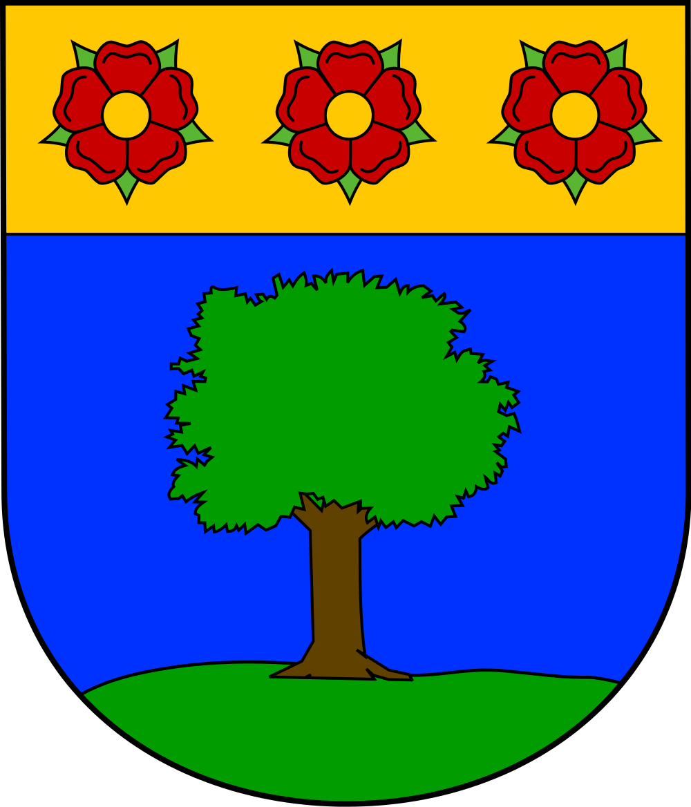 V modrém štítě pod zlatou hlavou se třemi červenými růžemi se zlatými semeníky a zelenými kališními lístky na zeleném návrší listnatý strom přirozené barvy.