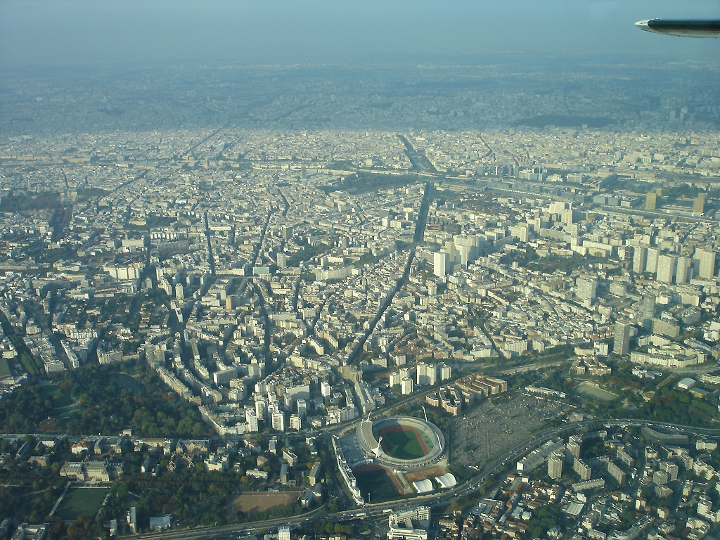 - English: View of the left bank of the Seine in Paris, with the Cité Universitaire and Parc Montsouris on the lower left, and the Charléty Stadium on the right, behind which appear the towers of Chinatown.